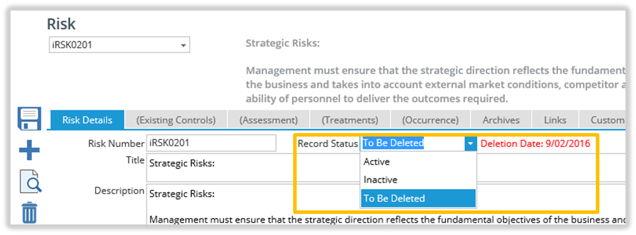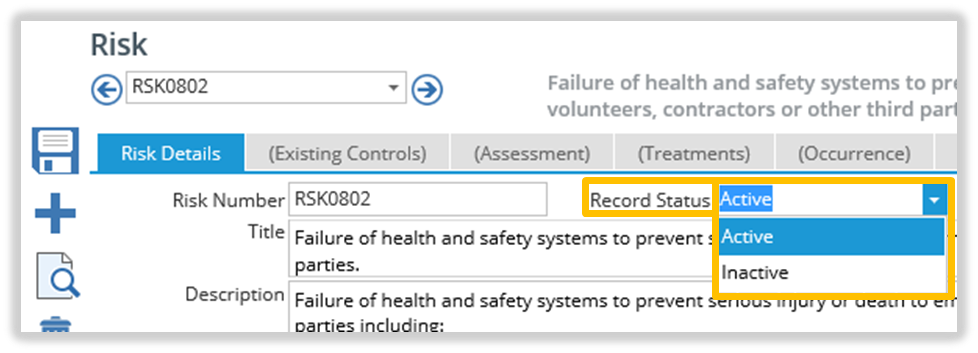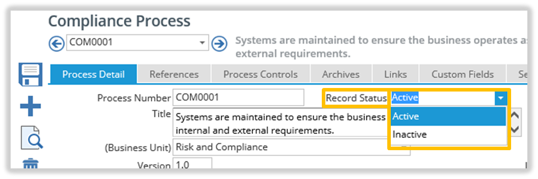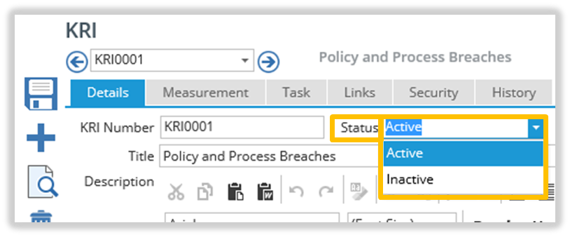 If a Compliance, Risk or KRI record is no longer current, but you do not want to delete the Record, the status can be changed from Active to Inactive.