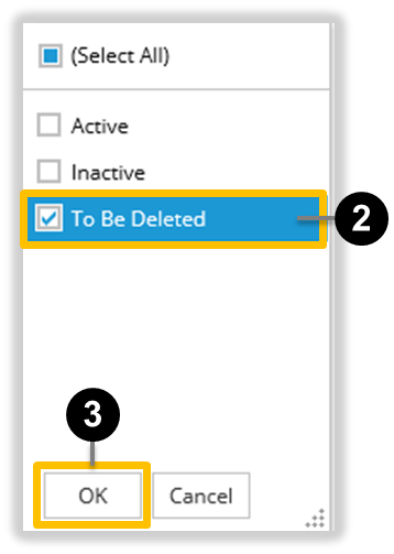 Deselect status Active and Inactive. Select ‘To Be Deleted’ 2.