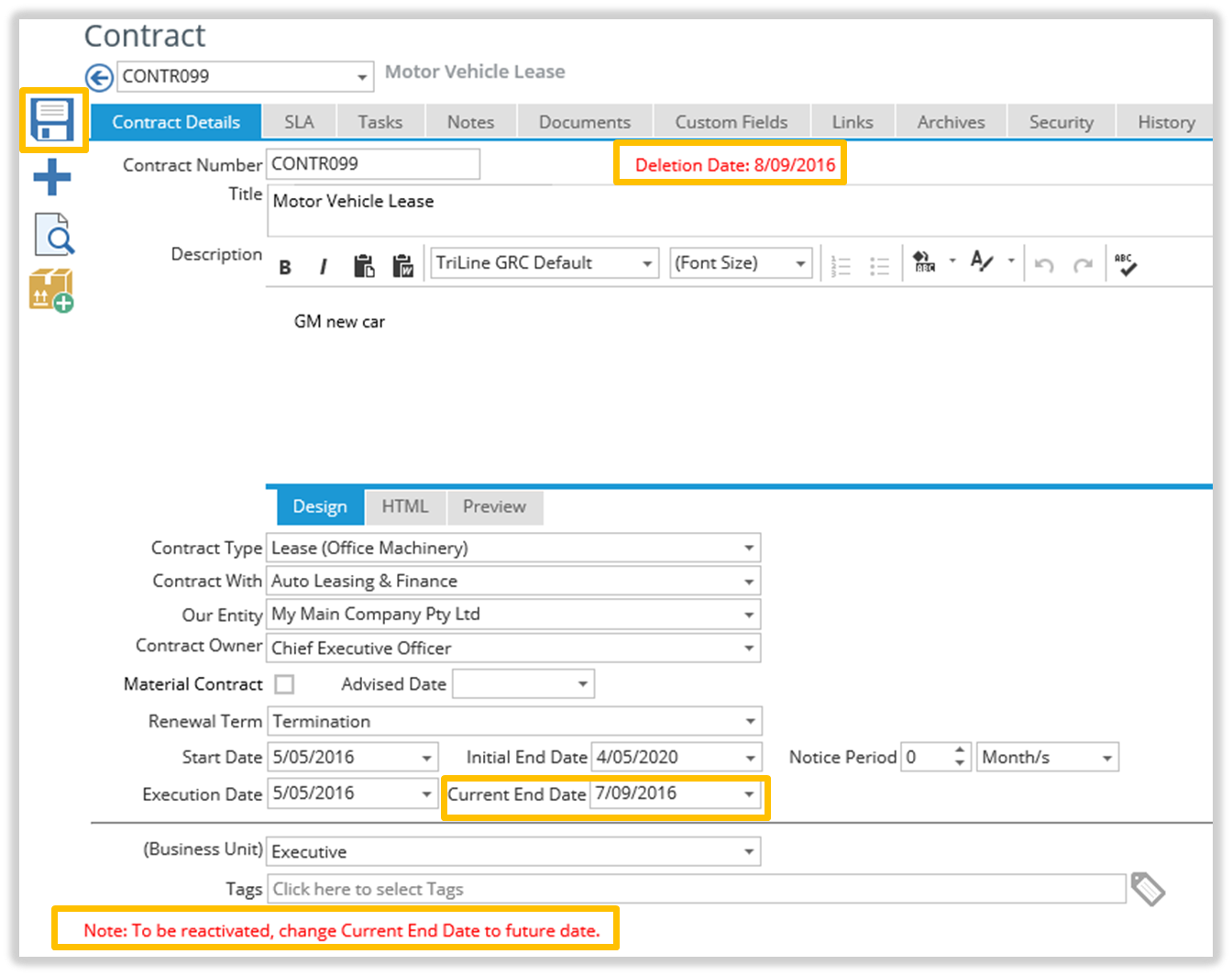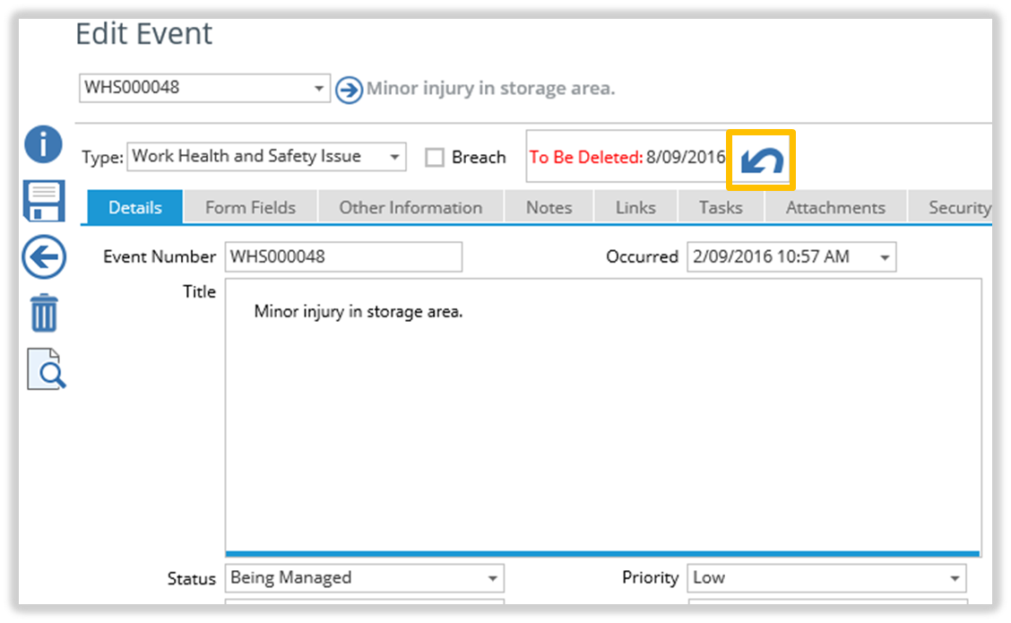 This procedure is only effective until the Retention Period defined by the ‘Deletion Days’ setting has elapsed. After this time, the Record no longer exists in your TriLine GRC database.