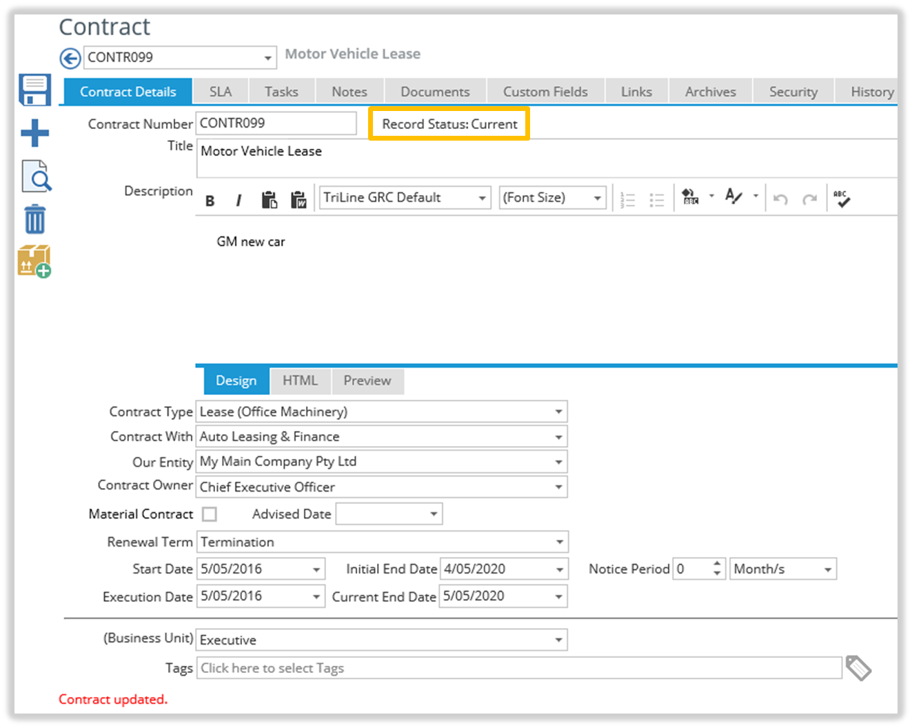 Contract Records also have a ‘Status’ field, but this field shows if a Contract is current.