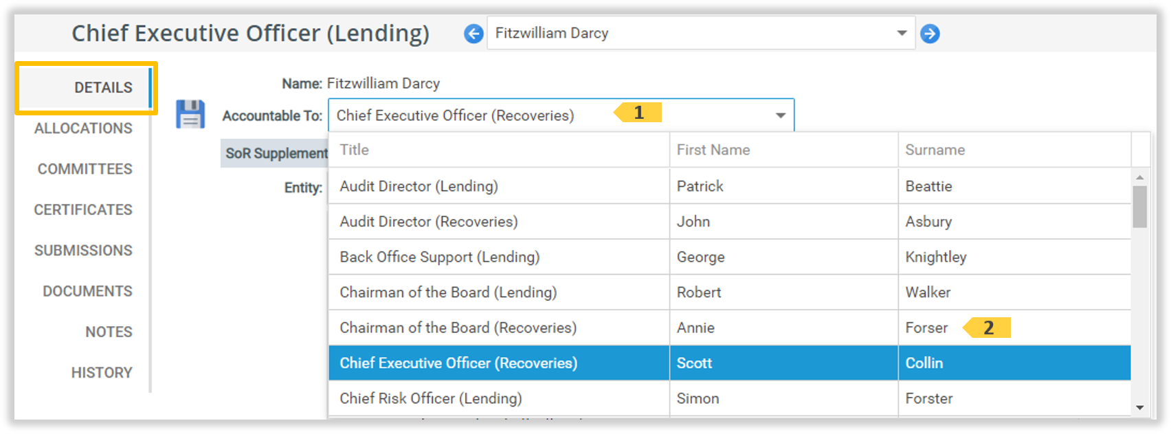 To change the ‘Accountable To’ person, click the ‘Accountable To’ 1 field to display the list of Accountable To people. Click the required ‘Accountable To’ 2 person from this list.