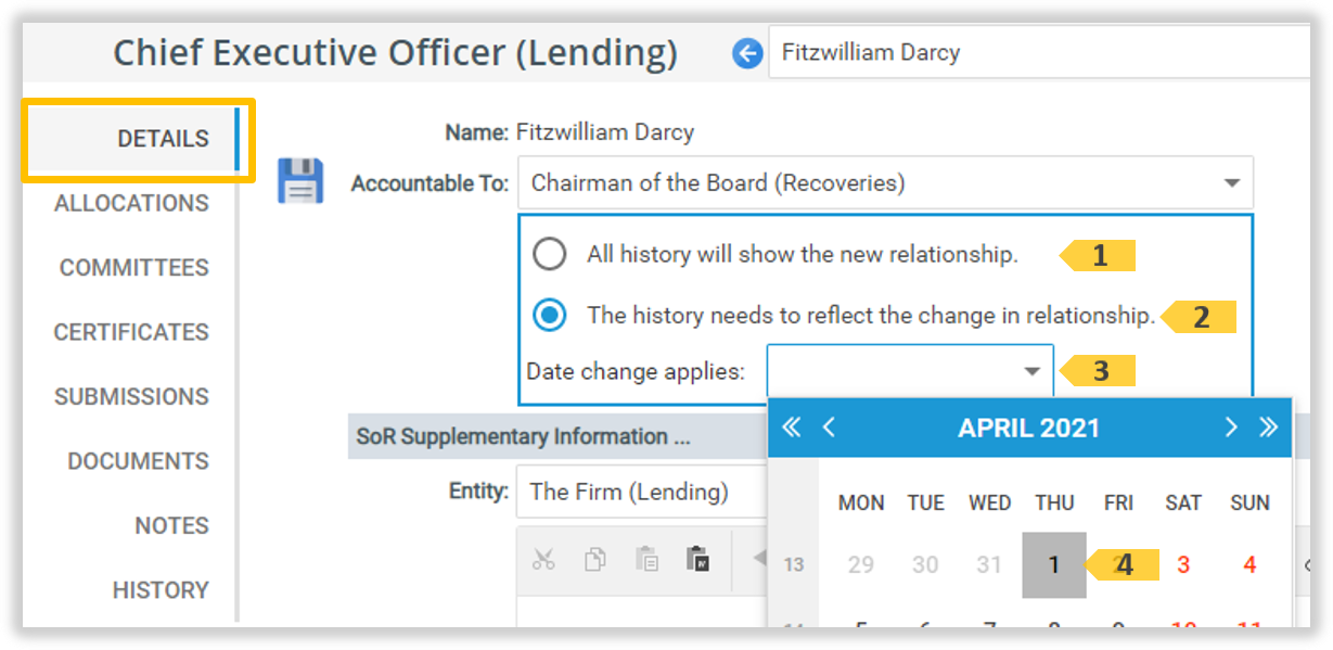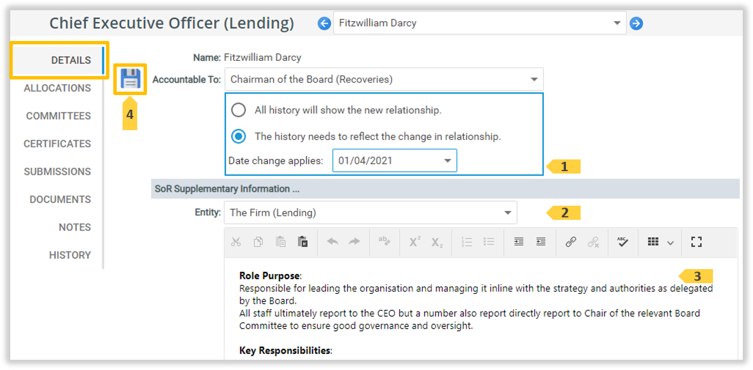 If the Date was selected, this will now display in the ‘Date change applies’ 1 field. Update the the SoR Supplementary fields Entity 2 and Information 3 as required. Click the Save 4 icon to update this record.