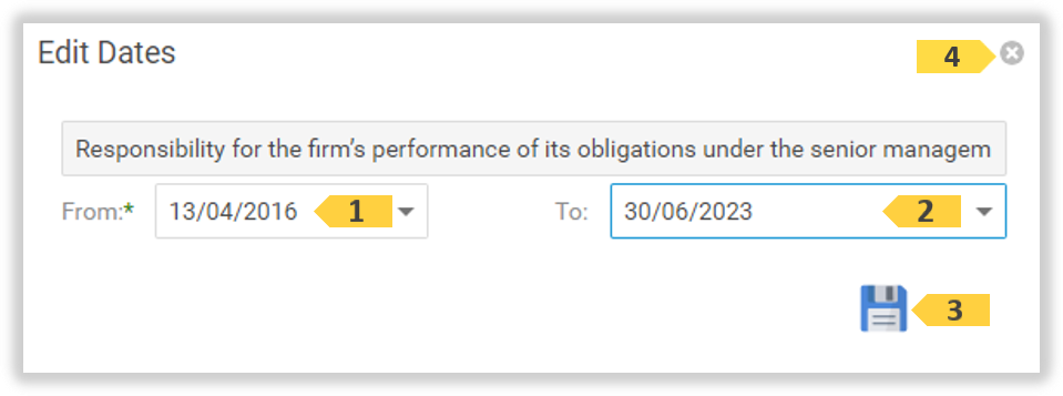 The ‘Edit Dates’ window displays. Update the From 1 and To 2 fields as required. Click the Save 3 icon to save these updates. (Or, click the Cancel 4 icon.)