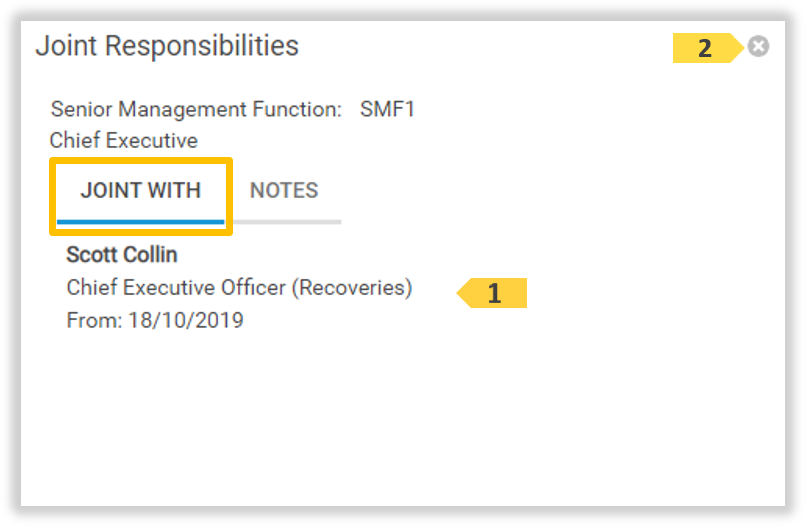The ‘Joint Responsibilities’ window displays. The list of Joint Responsibility people 1 is displayed on the ‘Joint With’ tab. Click the ‘Notes’ tab to view the Joint notes. Click the close window 2 icon to close this window.
