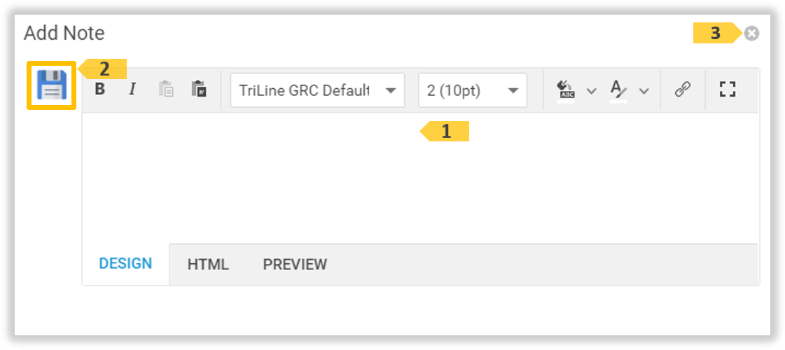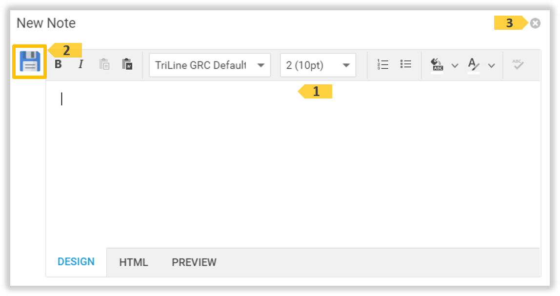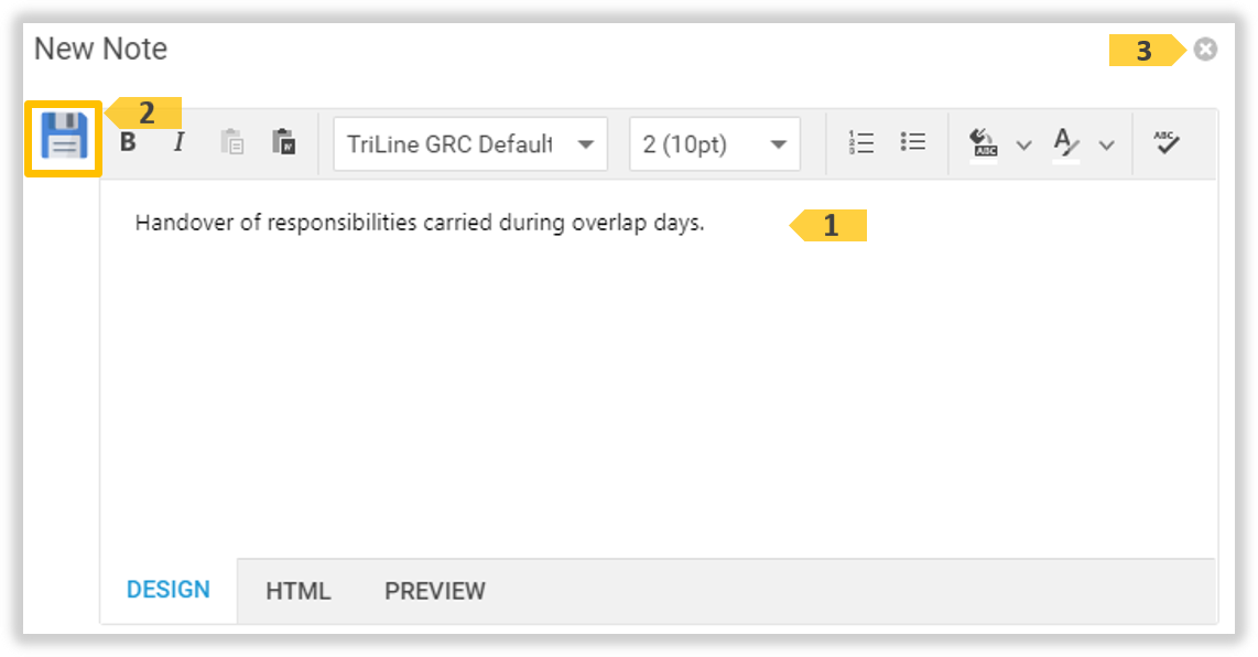 The ‘New Note’ window displays. Enter the Note text in the edit area 1. Then click the Save 2 icon to save this note. (Or, click the Cancel 3 icon to stop adding the Note.)