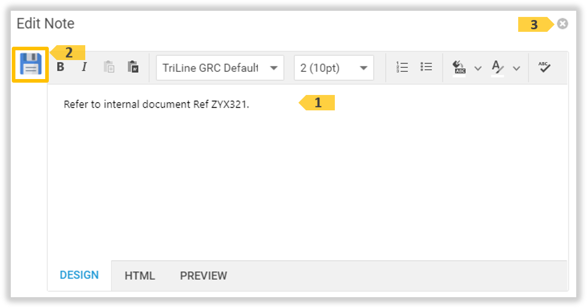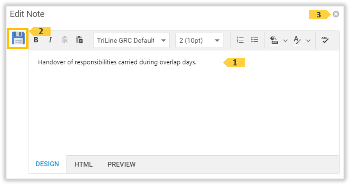 The ‘Edit Note’ window displays. Update the Note text in the edit area 1. Click the Save 2 icon to save these changes. (Or, click the Cancel 3 icon to stop updating the Note.)