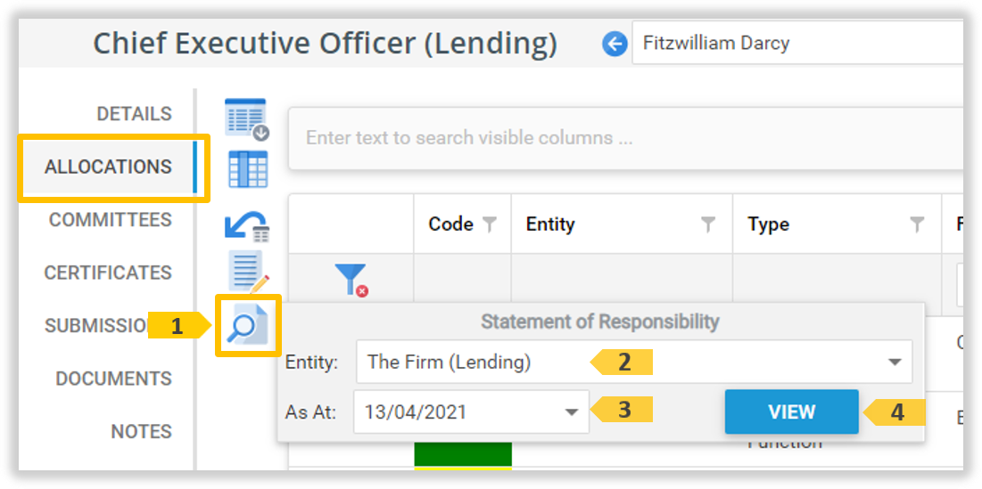 Hover over, or click, the show ‘Statement of Responsibility’ 1 icon. The ‘Statement of Responsibility’ selection panel appears. Select the required ‘Entity’ 2 and ‘As At’ 3 date, then click the View button.