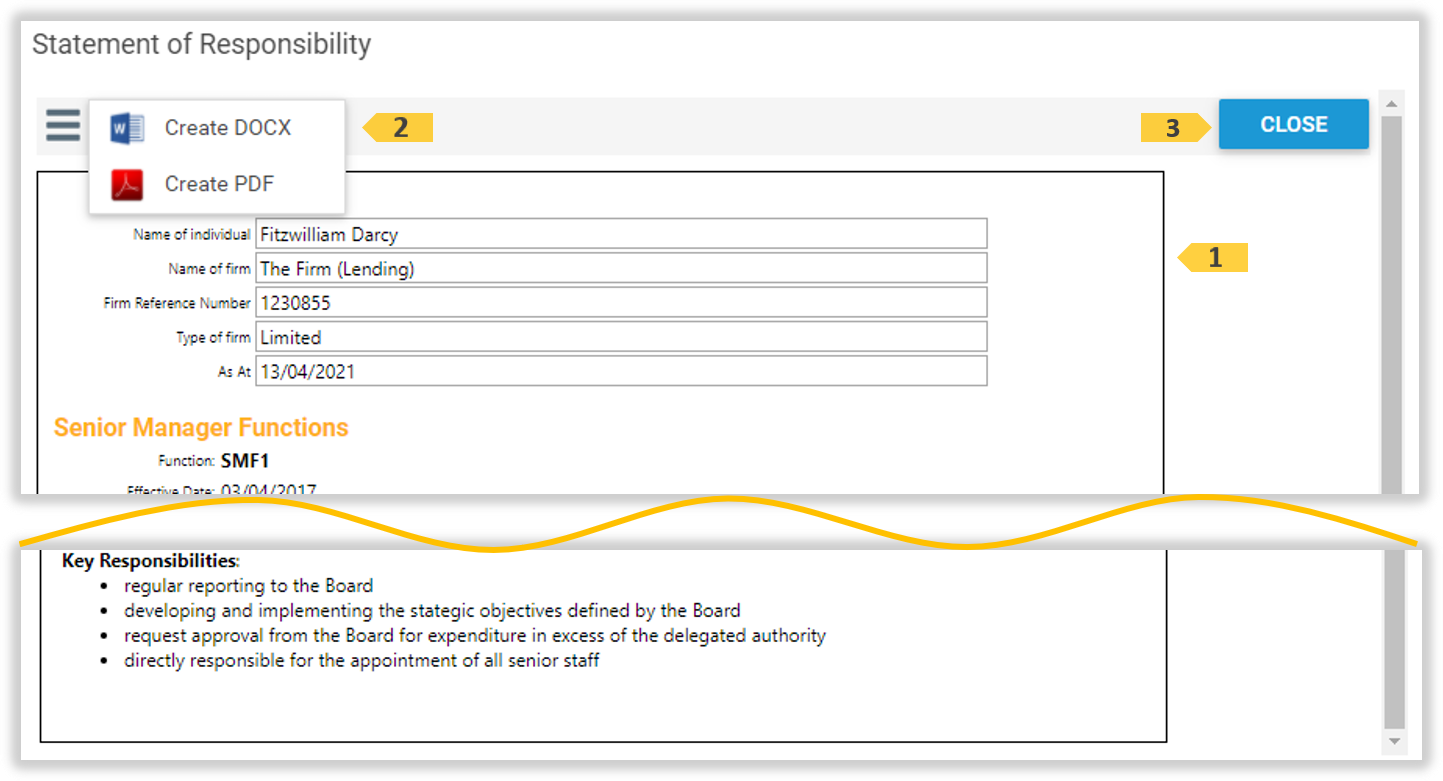 The ‘Statement of Responsibility’ window displays. If required, hover over, or click, the menu options 2 icon and select which document type you would like created. Click the Close 3 button to close this window.