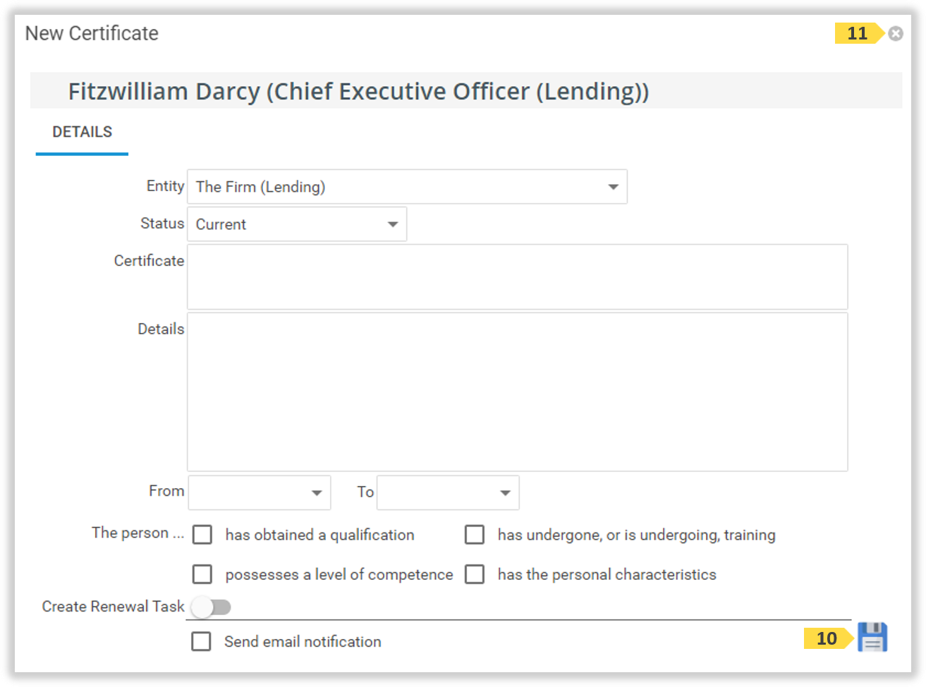 Clicking the cancel 11 icon will close the ‘New Certificate’ window without saving the record.