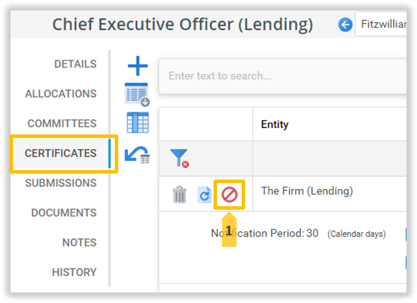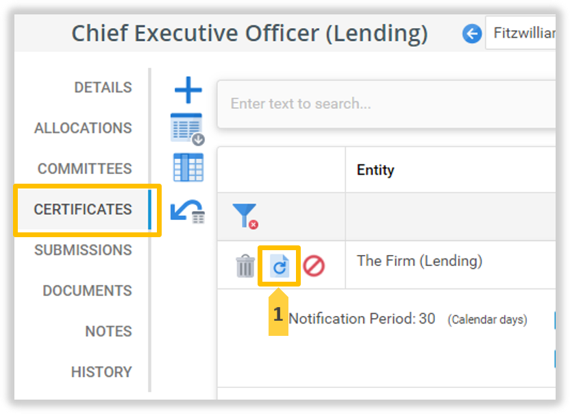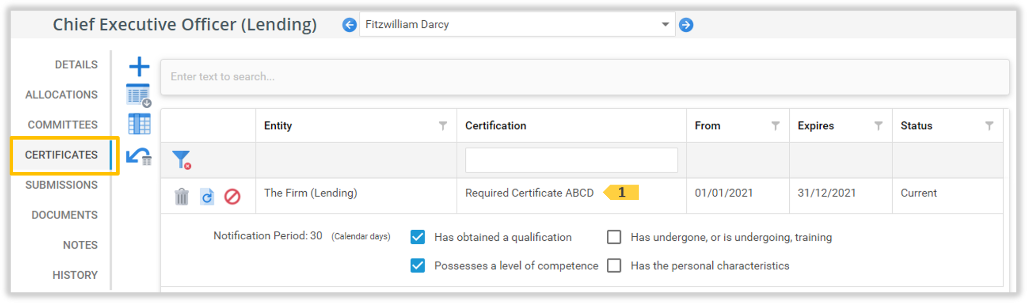 Click on a Certificate record 1 in the list. (See The Certificate Page elements in the Certificate help section for details on each field).