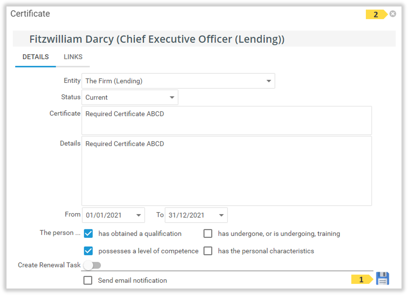 The ‘Certificate’ window displays. If the Save 1 icon is displayed, you have security access to update the values on this Certificate record. Update the fields and values as required. Click the Save 1 icon to save updates. (Or, click the cancel 2 icon to close the this window without saving the record.)