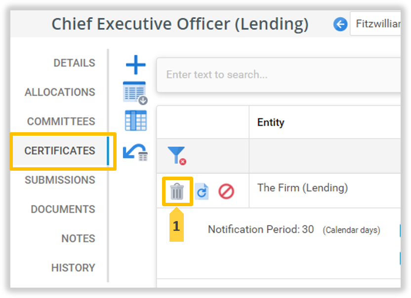 Note: Only Administrators and ‘Administrators - Accountability’ positions can delete a Certificate record.
