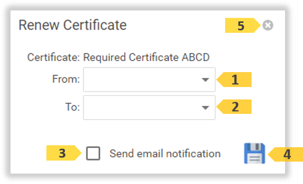 The ‘Renew Certificate’ window is displayed. Enter the From 1 and To 2 dates. Click the Send email notification 3 checkbox if required. Click the Save 4 icon to Save the Renew details. (Or, click the Cancel 5 icon to cancel.)