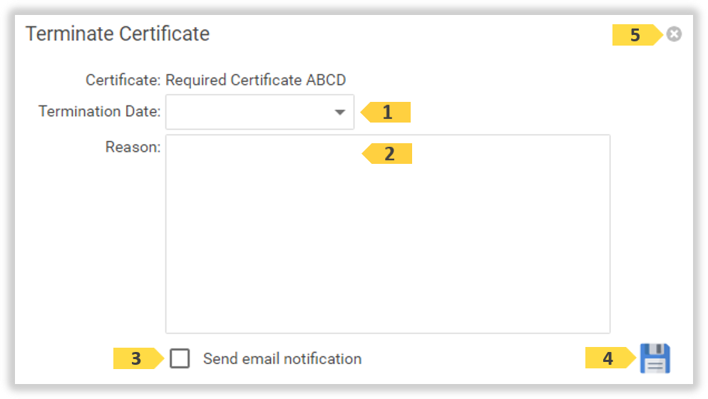 The ‘Termination Certificate’ window is displayed. Enter the Termination Date 1 and the Reason 2 for Termination. Click the Send email notification 3 checkbox if required. Click the Save 4 icon to Save the Termination details. (Or, click the Cancel 5 icon to cancel.)