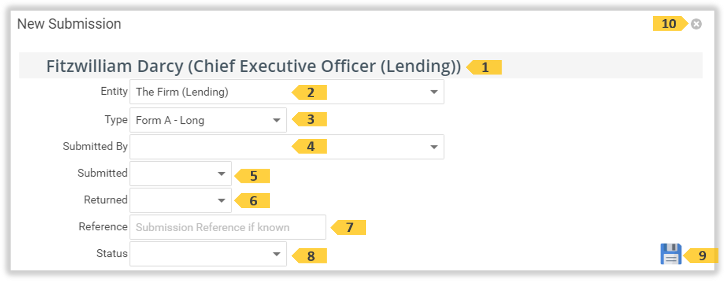 The ‘New Submission’ window opens. Complete the Submission details as required. (See The Submission Page elements for details on each field). Click the Save 9 icon to complete adding the new Submission record. The Submission List will display with this new record. (Or, click the cancel 10 icon to close the window without saving.)