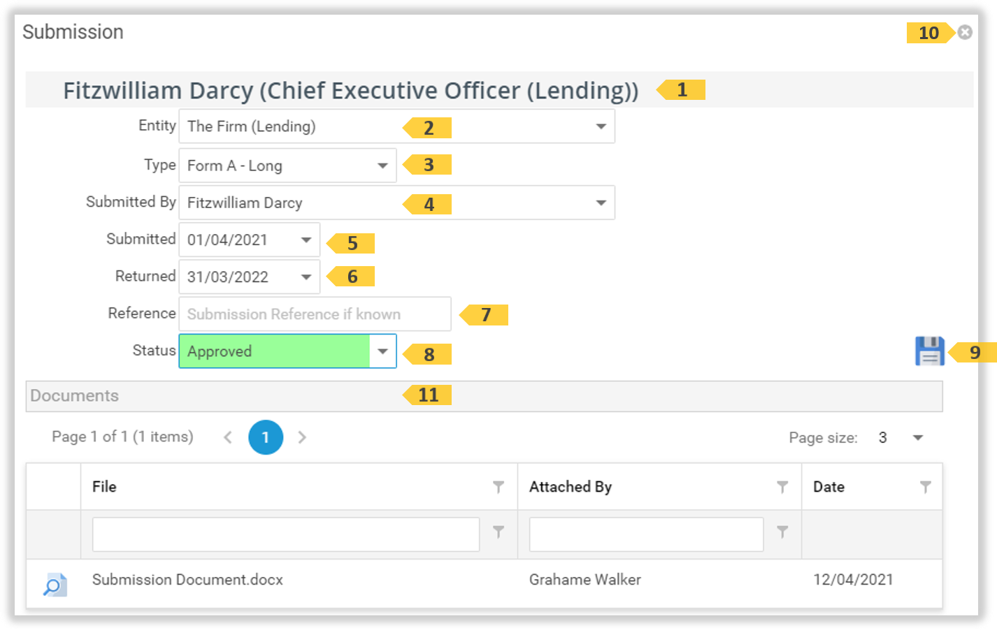 | 4 | ‘Submissions’ List | This list displays all the Submissions to this Accountable Person. Click a Record in this list to open the Record in its own page for viewing or editing depending on your Security access. |