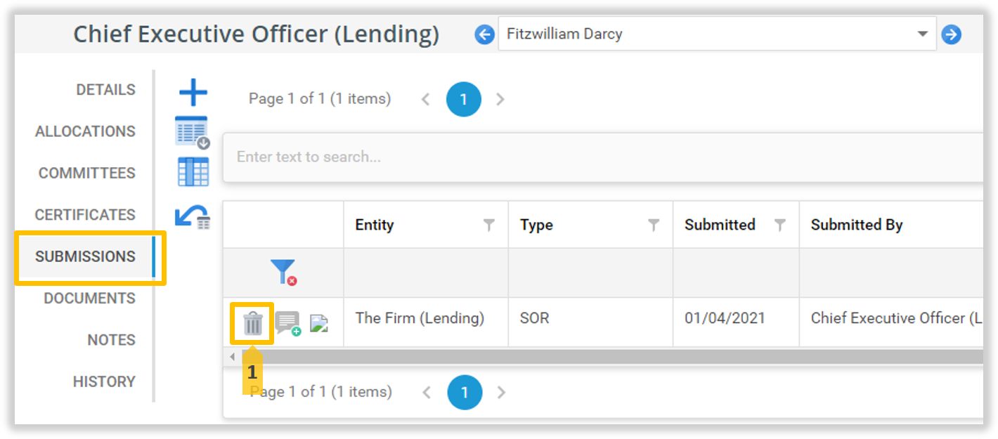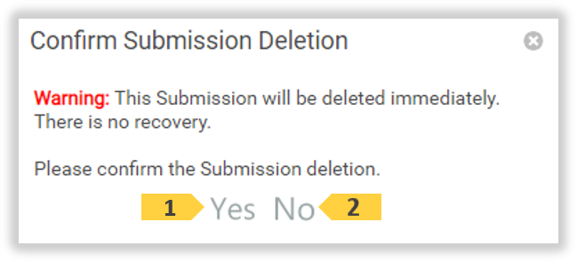 | 5 | ‘Delete Submissions’ icon | Click this icon to Delete a Submission. A ‘Confirm Delete’ dialog is displayed to remind you that deleting this Record will result in instant and unrecoverable removal of data. Note: This icon only displays if you have ‘Edit’ security access. |