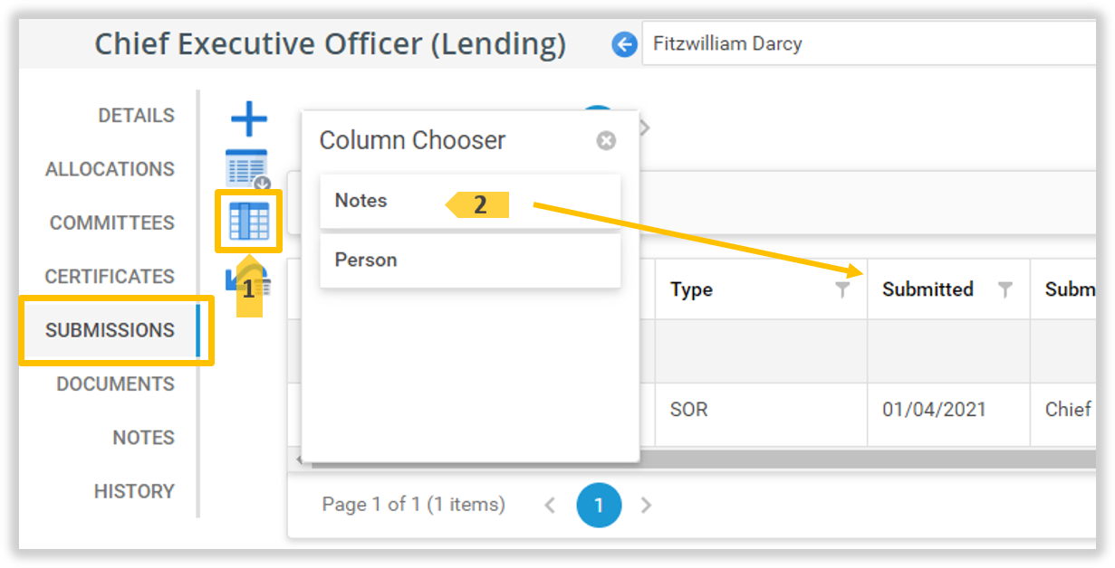 On the ‘Submissions’ tab, click the ‘Hide/Show Columns’ 1 icon. Click and drag the Notes 2 Column into the Submission columns.