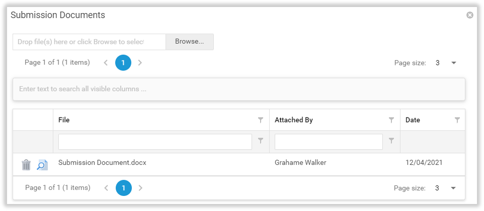 The ‘Submission Documents’ window is displayed. Add, view or remove Submission Documents as required.