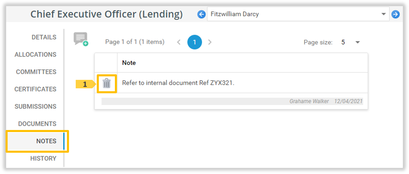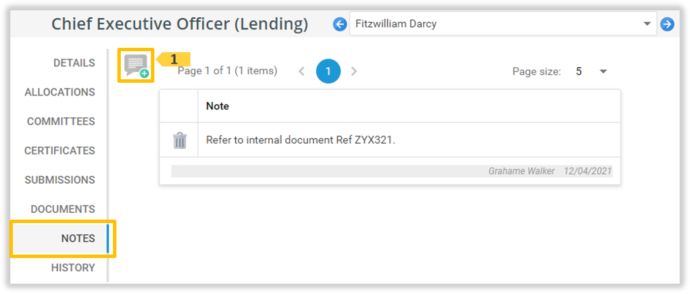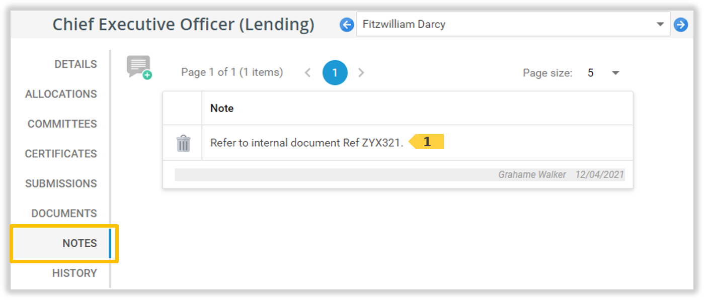 | 1 | ‘Add Note’ icon | Click this icon to a new Note. The ‘Add Note’ window is displayed. Note: This icon only displays if you have ‘Edit’ security access. |