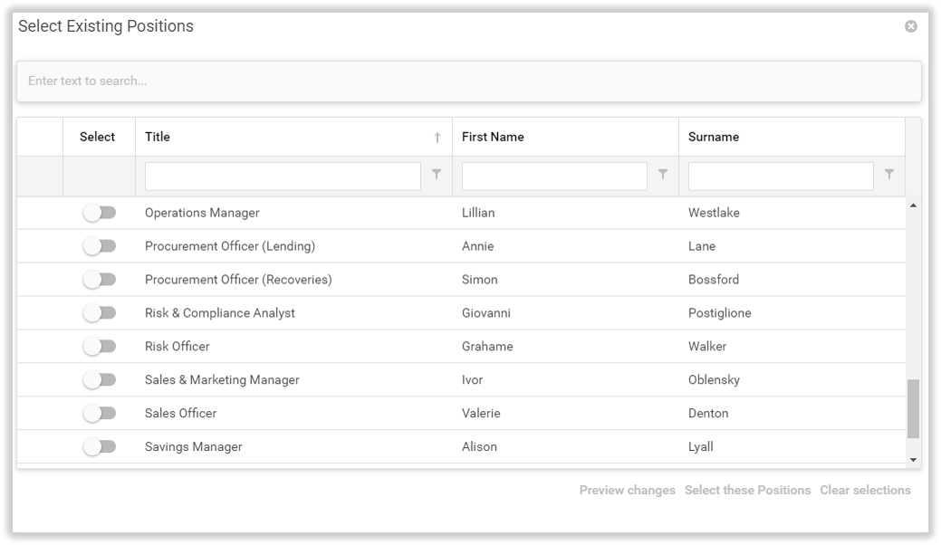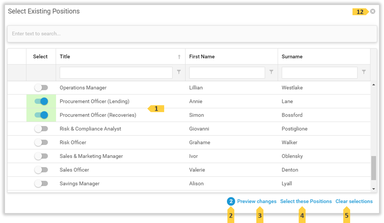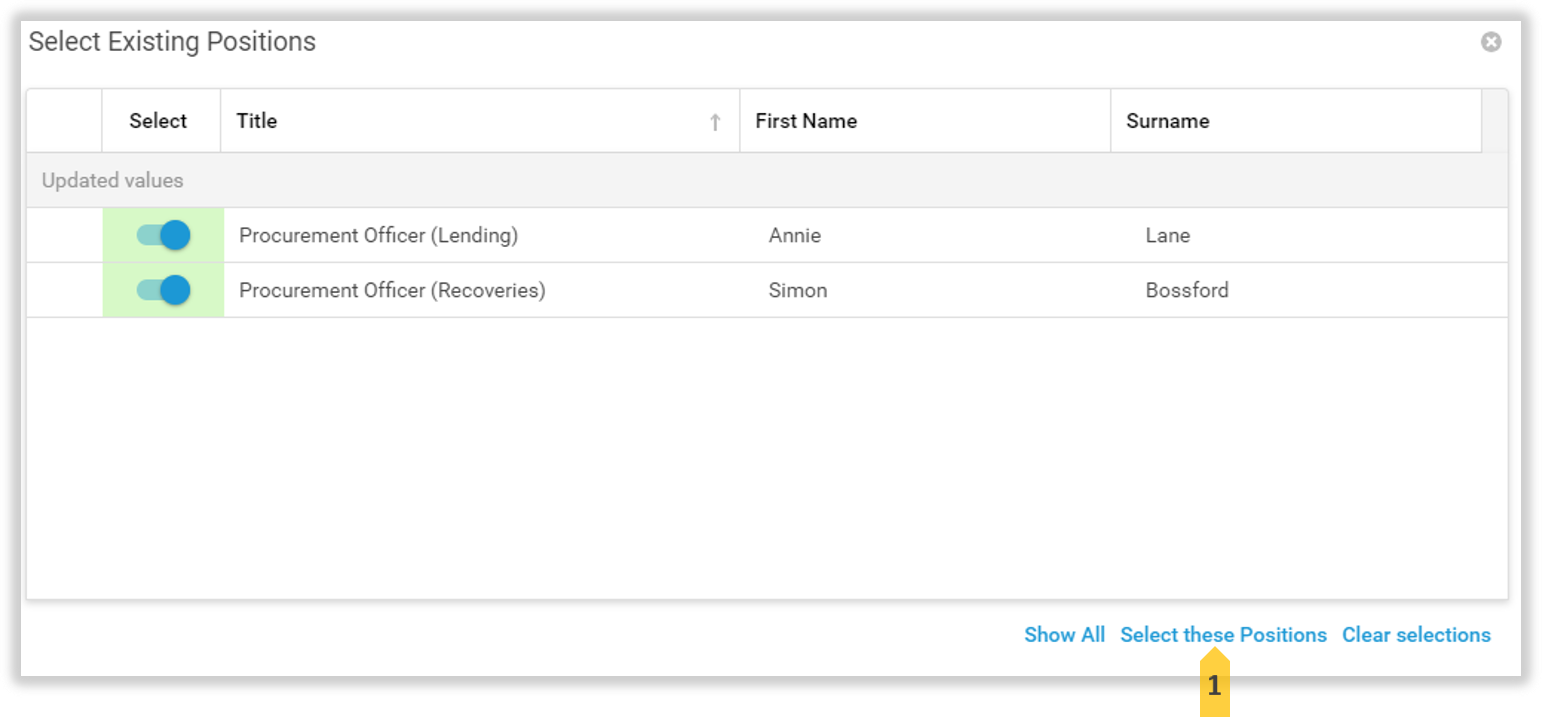 The list is filtered to display your selections. Selections can be removed if required. Click the Select these Positions 1 button, to add these Positions to the Positions that can access SMCR.