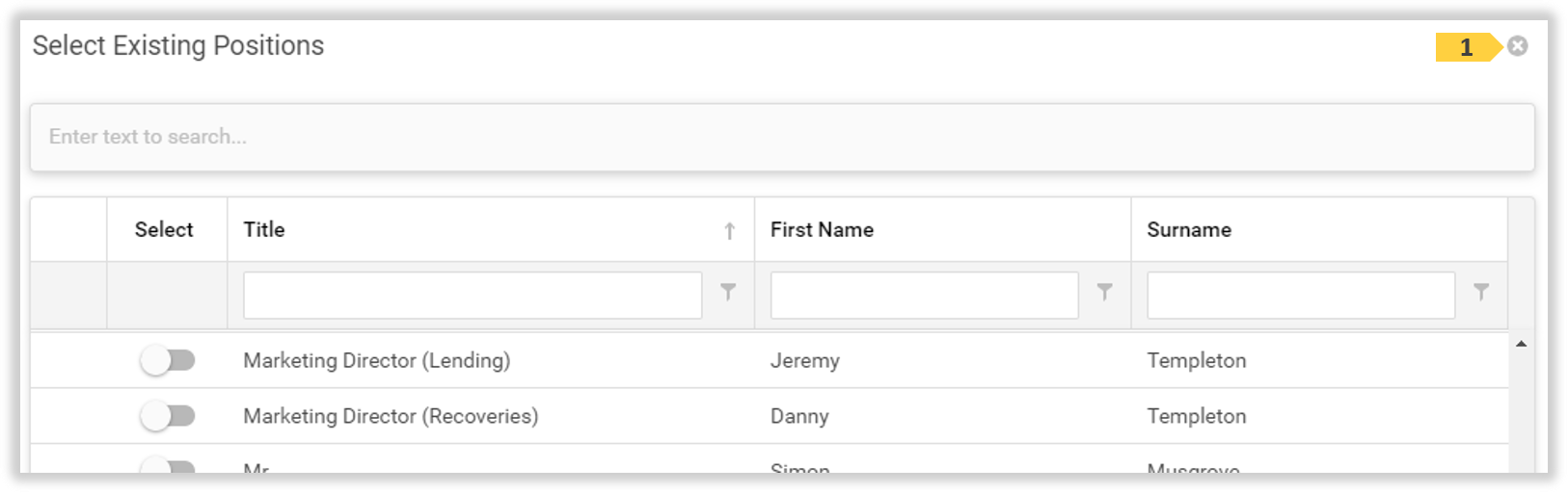 Those positions now have access to SMCR. The list of remaining Positions that do not have access to SMCR is re-displayed. More Positions can be select by following steps 4 and 5. To finish, click the Close window 1 icon.
