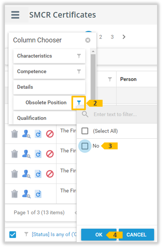 | 7 | SMCR Column Headers | Use the controls in the column headers to filter the SMCR Records. Perform advanced filtering of the List to find a particular SMCR Record. |
